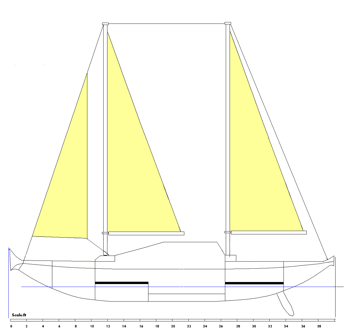 and a smaller cabin, and it is anticipated that weight would be less, thus sail area is only 85% of Gaia 1 tacking outrigger.