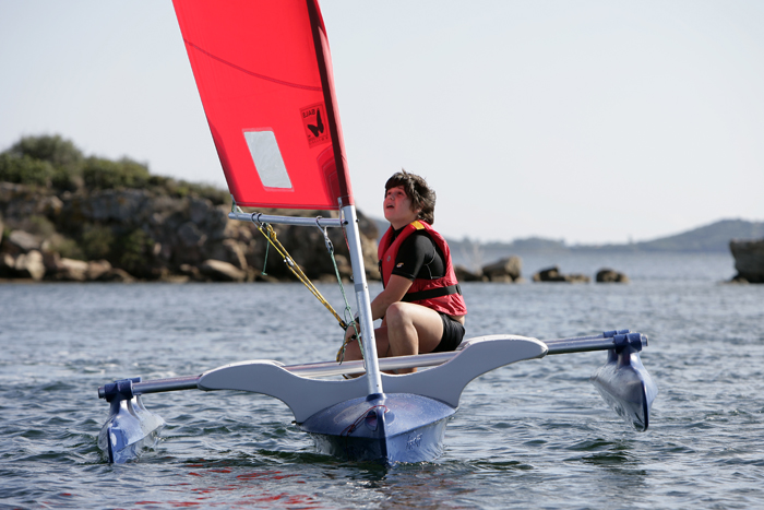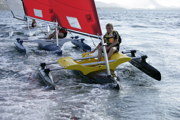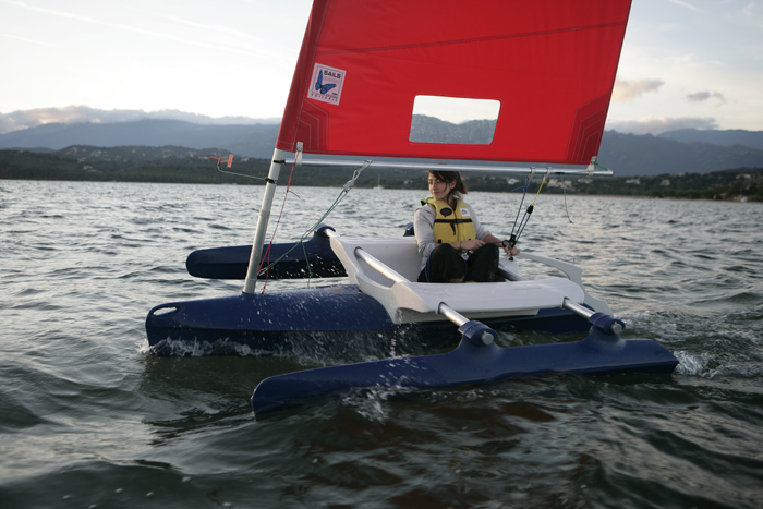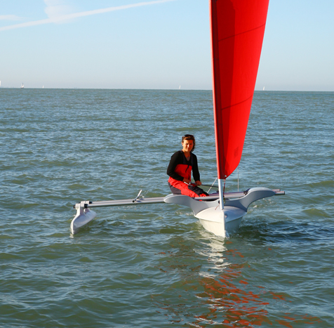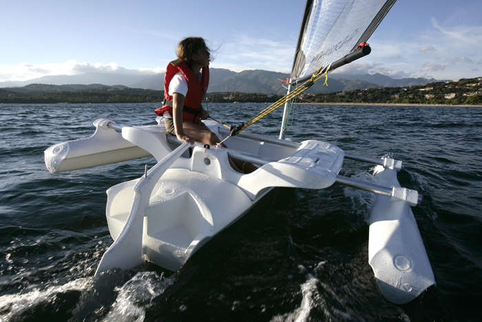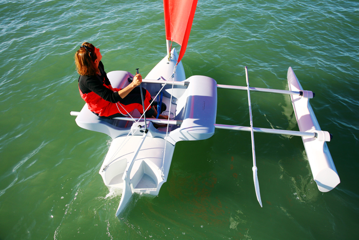 This is a small boat with both trimaran and tacking proa versions. It is a production built boat