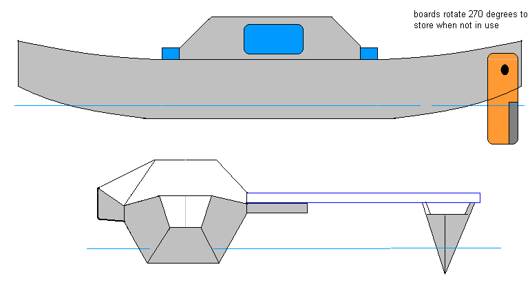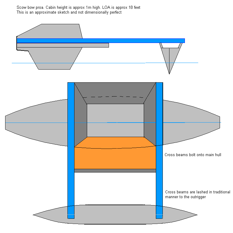 This is a concept sketch for a small proa with a large comfortable cabin. No doubt performance would be less than a sleeker, finer lower proa. Comfort has been put ahead of speed. The cabin is inspired by Bolger's birdwatcher design. The proa has rudderboards that contribute to bother steering and lateral resistance. As they are further to the ends than the Mbuli proa, logic suggests that they could be smaller. These rudderboards swivel 270 degrees in case of grounding at speed thus eliminating a potential source of damage. Rudderboards mounted on crossbeams would be a valid option as well. I have not shown a rig. My guess is that a twin mast setup would suit best, whether each rig is junk, bermudan, sprit or lug I do not know. |