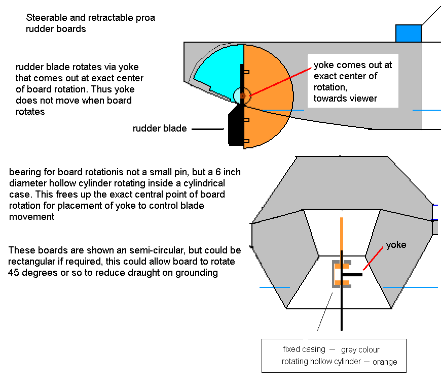 This version seems mechanically straightforward to make. It has the advantage of no drag inducing notch. Rudder blades are simple to make one piece plywood (or wood). No trim tabs are required. The roundish shape that meets the water would create less drag than the flat transom of earlier versions. The drum would pivot on a vertical axis and be approx 40 to 50cm in diameter. A slot is made in this drum to accept the pivoting rudder blade. This drum based rudder version seem to be a good fit for the blunt ends of scow-proa