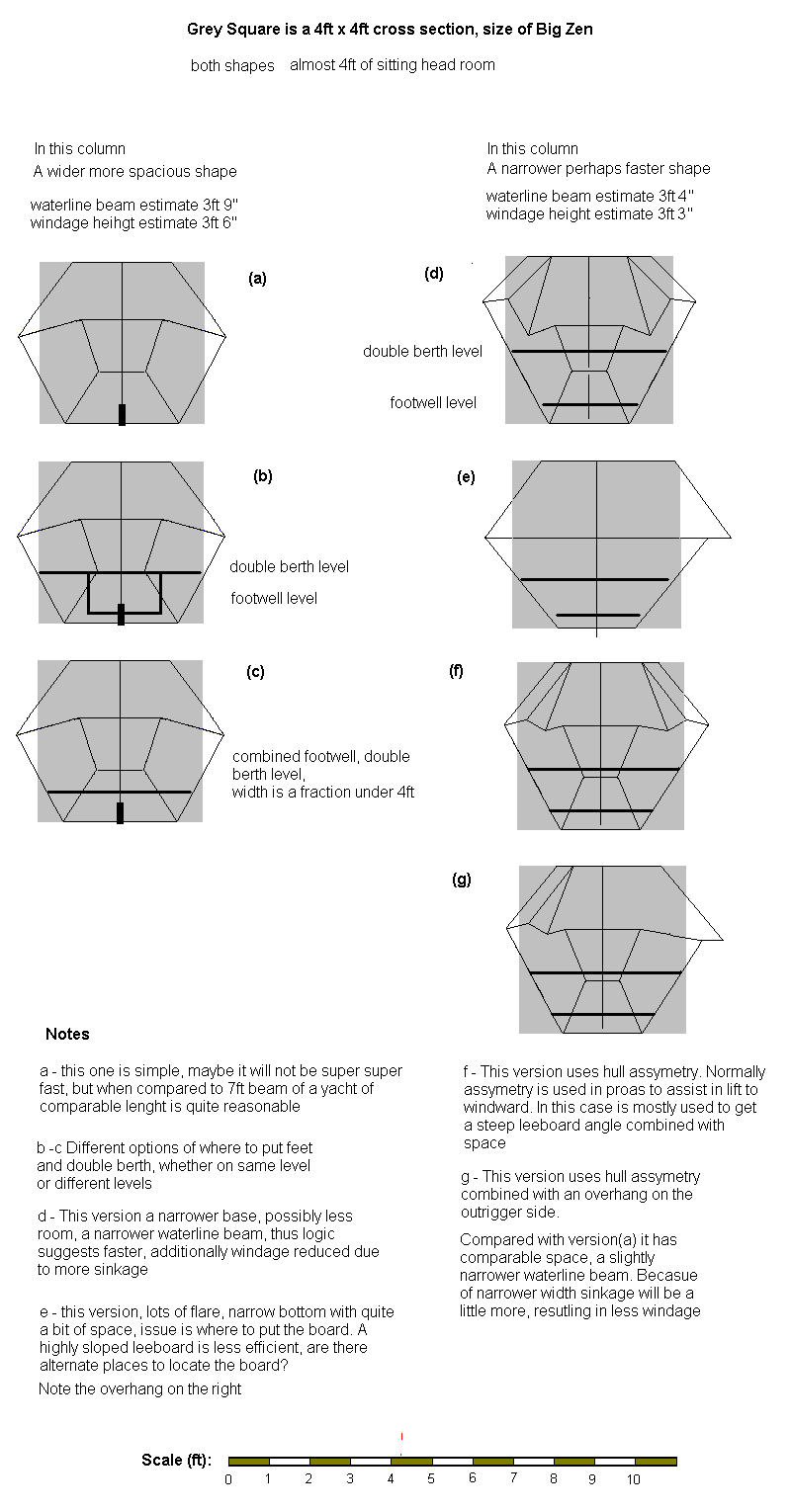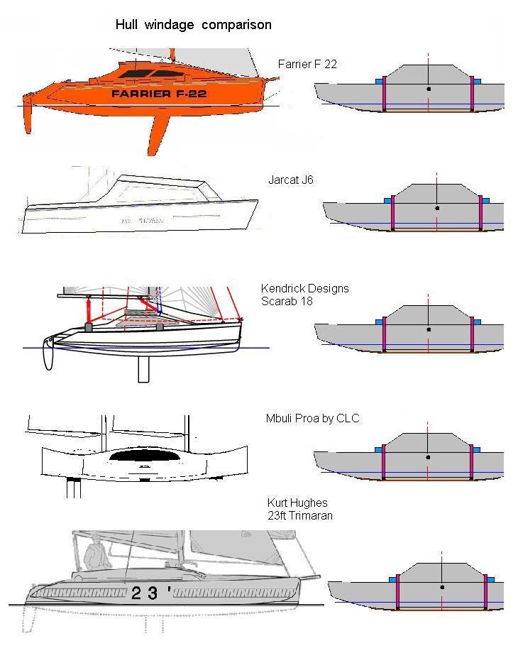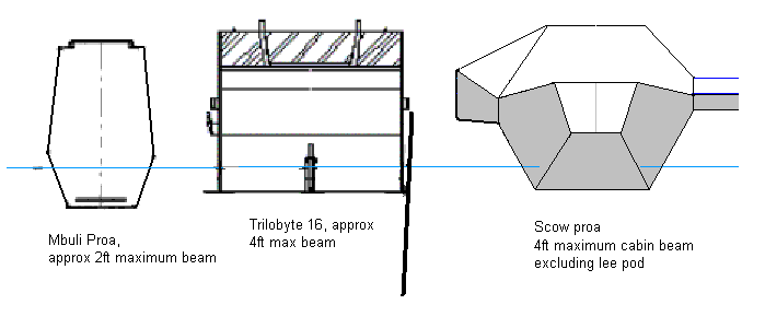 ScowProa has evolved from a one person boat designed for the sea to a 2 person boat for more protected waters. As such more windage is deemed permissable. The intention is to give comfortable sitting headroon, and this turns out to be approximately 4ft. Now with a sinkage of approximately 6 inches, that leaves approx 3.5ft of windage. Now the heavily sloped sides of ScowProa means that this 3.5ft has less windage of a conventional cabin of similar height. Looking at the above diagram it can be seen that ScowProa cabin is lower than the Farrier and Jarcat boats, is similar in height to the Kendrick designs tri and it higher than the Mbuli proa and the Kurt Hughes 23ft tri