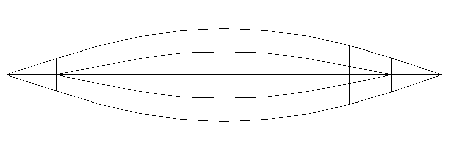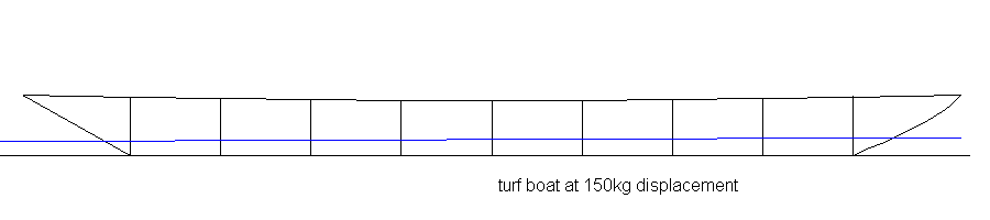 Turf boats were used historically for carrying turf (a fuel) on inland waterways. I feel this would make a very fine river rowboat. It has in my opinion many positives. One being that it has such simple lines it is very easy to construct. It has a fine hullform that should be easily driven with moderate force. The wide flare provides for a wide separation for the oarlocks allowing for efficient rowing. This 5m long hull has a waterline beam of 75cm at 150kg displacement. I feel that this is a good compromise between a fast narrow hull and a wider more stable hull.